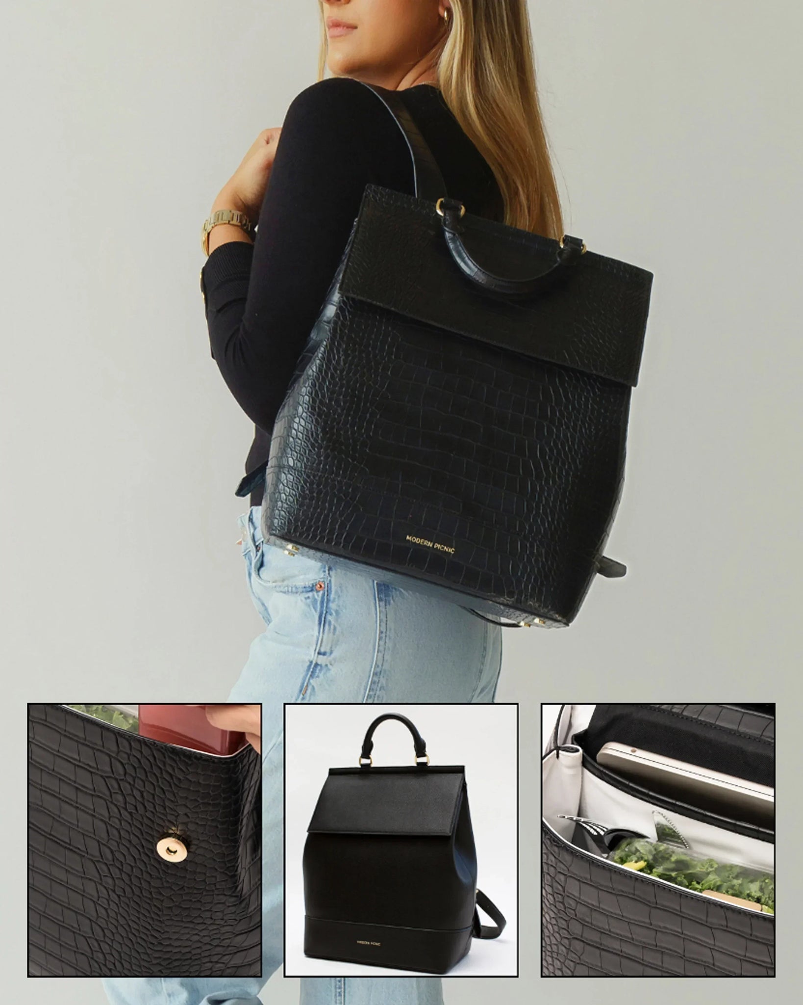 Meet the Modern Picnic Backpack - A chic, vegan leather backpack with a padded laptop sleeve and insulated compartment; perfect for carrying your laptop, lunch + more. Your day is packed, let us carry some of the weight.